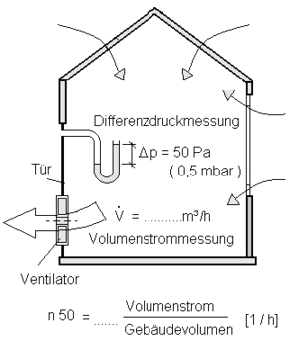 Ermittlung der Luftwechselrate n50 Durch einen (geeichten) Ventilator wird Luft in das zu untersuchende Gebäude gedrückt oder herausgesaugt. Die Stärke des Ventilators wird so eingestellt, dass zum Umgebungsdruck eine Druckdifferenz von 50 Pa (Pascal) entsteht. Druckdifferenzen entstehen auch natürlich, wenn Wind bläst. Bei Windstärke 5 ist diese Druckdifferenz auch etwa 50 Pa. Der Ventilator wird meistens mit einem Rahmen in die Öffnung einer geöffneten Außentür eingesetzt, daher der Name Blower-Door-Test (deutsch: Gebläse-Tür-Messung). In der Blower-Door sind Messinstrumente eingebaut, die die Druckdifferenz und die Luftmenge messen, die der Ventilator transportiert. Die Drehzahl des Ventilators wird so eingestellt, dass sich ein bestimmter Druck zwischen Außen- und Innenraum aufbaut. Dabei muss er soviel Luft nach außen befördern, wie durch Leckstellen in das Gebäude eindringt (bei der Unterdruckmessung). Der gemessene Luftstrom wird durch das Volumen des Gebäudes geteilt. Diesen Wert kann man nun mit anderen Gebäuden und Normen vergleichen. Der Blower Door Test gliedert sich in drei Phasen.