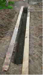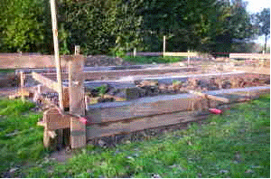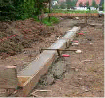 Der Beton wird in einer Betonmischmaschine erdfeucht angemischt und in Lagen von ca. 15 cm in den Graben eingebracht. Die Bretter an den Seiten des Grabens verhindern, dass dabei Erde in den Graben fällt. Die einzelnen Lagen müssen verdichtet werden. Hierfür verwenden wir eine kleine Gartenharke. Ist beim Verfüllen des Grabens das Niveau des Bodens erreicht wird eine Schalung gebaut. Die Schalung wird in Flucht und Höhe exakt ausgerichtet. Mit der über das Schnurgerüst gespannten Maurerschnur lässt sich die geplante Höhe des fertigen Fundamentes genau bestimmen.